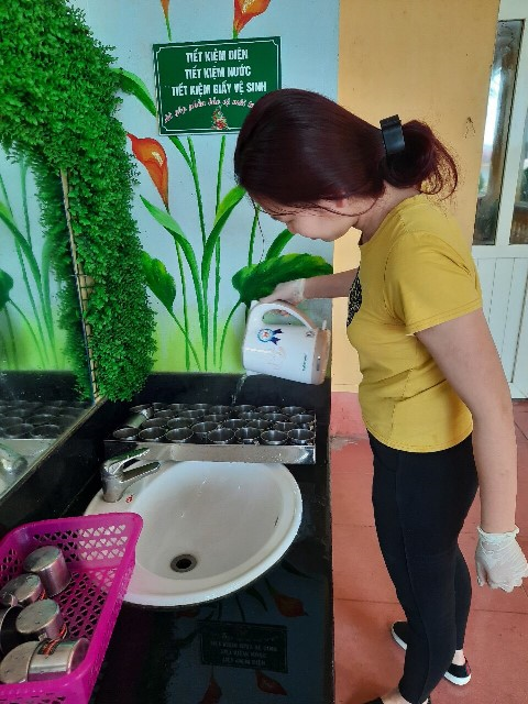 Tất cả các lớp học, phòng chức năng, hành lang, khu vực sinh hoạt chung đều được phun khử khuẩn bằng dung dịch Cloramin B. Các đồ dùng học tập, bàn ghế,… được lau chùi vệ sinh sạch sẽ. Mọi vị trí có tiếp xúc với học sinh đều được vệ sinh cẩn thận. Tay nắm cửa, giá để giày dép,… đều được lau khử khuẩn và “không bị bỏ sót” dưới bàn tay của những các thầy cô giáo và nhân viên nhà trường.